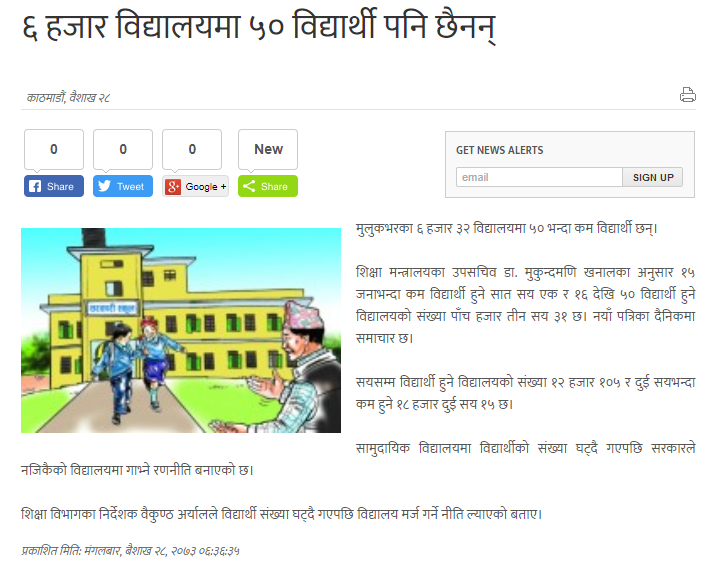 शिक्षा कुनै पनि देश र समाजको विकासको निम्ति अपरिहार्य रहेको बिचारलाई नकार्न मिल्दैन । आजको मानब समाज यस अवास्थासम्म आइपुग्नुमा शिक्षाको ठुलो भूमिका रहेको छ । सायद यसैकुरालाइ मध्यनजर गरि नेपालको संविधानले शिक्षालाइ नागरिकहरुको आधारभूत अधिकारको रुपमा ब्याख्या गरि विद्यालय शिक्षा अनिवार्य र निःशुल्क हुने व्यवस्था गरेको हुनुपर्दछ । आज शिक्षाको सवाल नीतिगत तहदेखि आम जनमानसहरुबीच ठुलो चर्चा-परिचर्चा र बहसको बिषय बनेकोले पनि यसको महत्वलाइ दर्साउदछ । नेपालमा सरकारी र निजि विद्यालयहरुले शिक्षा क्षेत्रमा आफ्नो सेवा प्रदान गर्दै आएको कुरा हामि सबैलाई ज्ञात नै छ ।