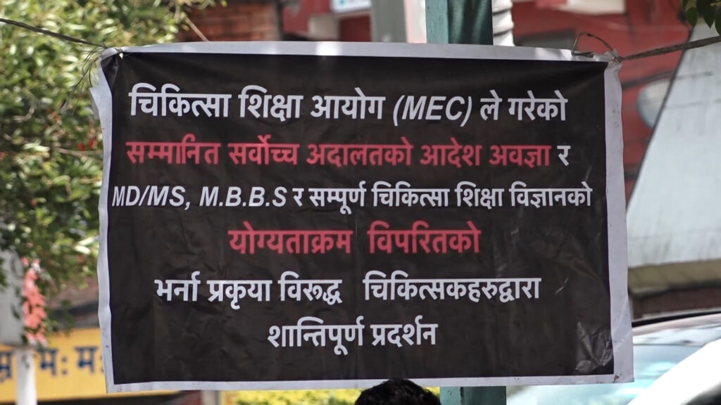 काठमाडौँ – एमडी/एमएस, एमबीबीएस र सम्पूर्ण चिकित्सा शिक्षा विज्ञानको योग्यताक्रम विपरितको भर्ना प्रक्रियाबिरुद्ध चिकित्सकहरुले शान्तिपूर्ण प्रदर्शन गरेका छन् । बुधवार माईतीघर मण्डलामा भेला भएर चिकित्सकहरुले चिकित्सा शिक्षा आयोगले गरेको सर्वोच्च अदालतको आदेश अवज्ञा र एमडी/एमएस, एमबीबीएस र सम्पूर्ण चिकित्सा शिक्षा विज्ञानको योग्यताक्रम विपरितको भर्ना प्रक्रियाबिरुद्ध शान्तिपूर्ण प्रदर्शन गरेका हुन् ।