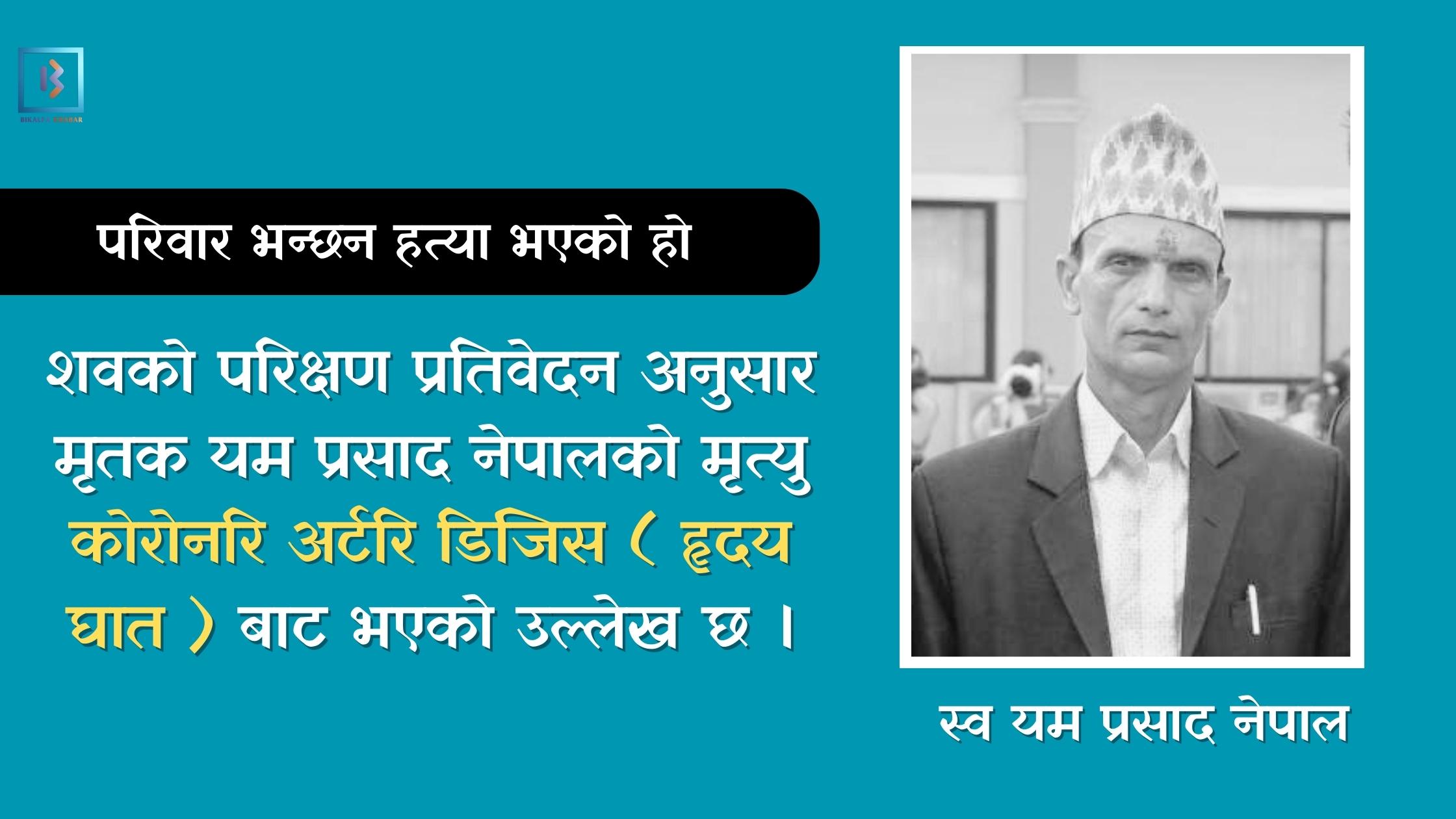 शवको परिक्षण प्रतिवेदन अनुसार मृतक यम प्रसाद नेपालको मृत्यु कोरोनरि अर्टरि डिजिस ( हृदय घात ) बाट भएको उल्लेख छ । परिक्षण प्रतिवेदनका अनुसार टाउको , अनुहार तथा पाइतालामा वोधो चोटहरु देखिएका छन् तर सो चोटहरु मृत्यु गराउन सक्ने गम्भीरताको नभएको उल्लेख छ। मुटुको जाँच गर्दा दुइवटा मुख्य रगत नलिहरुमा गम्भीर किसिमको अवरोध देखिएको प्रतिवेदनमा उल्लेख छ ।