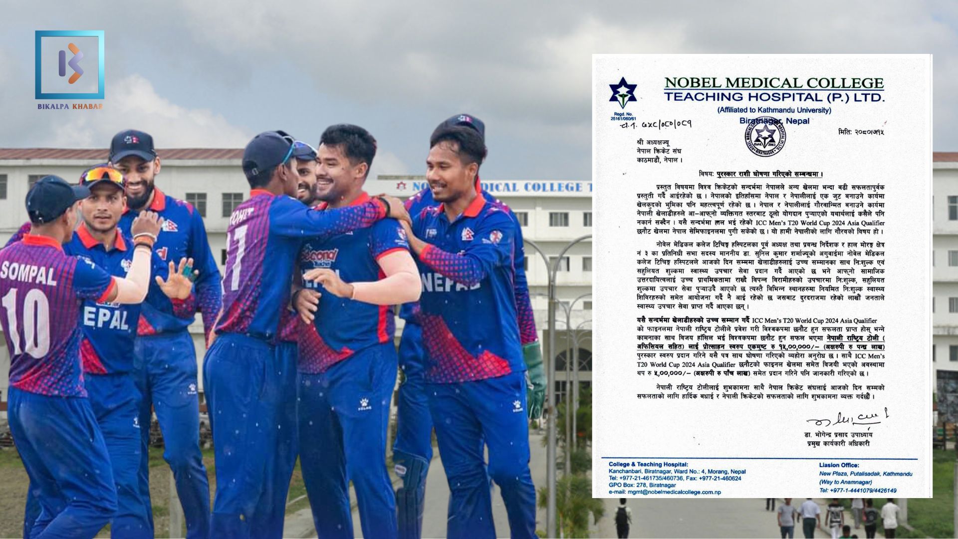 काठमाडौँ। आईसीसी टी-२० विश्वकप क्रिकेट छनोट खेलिरहेको नेपाली क्रिकेट टोलीलाई नोबेल मेडिकल कलेजले रु १५ लाख रुपैयाँ पुरस्कार दिने घोषणा गरेको छ। सो पुरस्कार रकम प्राप्त गर्न आईसीसी टी-२० विश्वकप २०२४ क्रिकेटमा छनोट हुनुपर्ने छ। साथै जारी प्रतियोगिताको फाइनलमा विजेता भएमा थप पाँच लाखसमेत दिने बताएको छ।