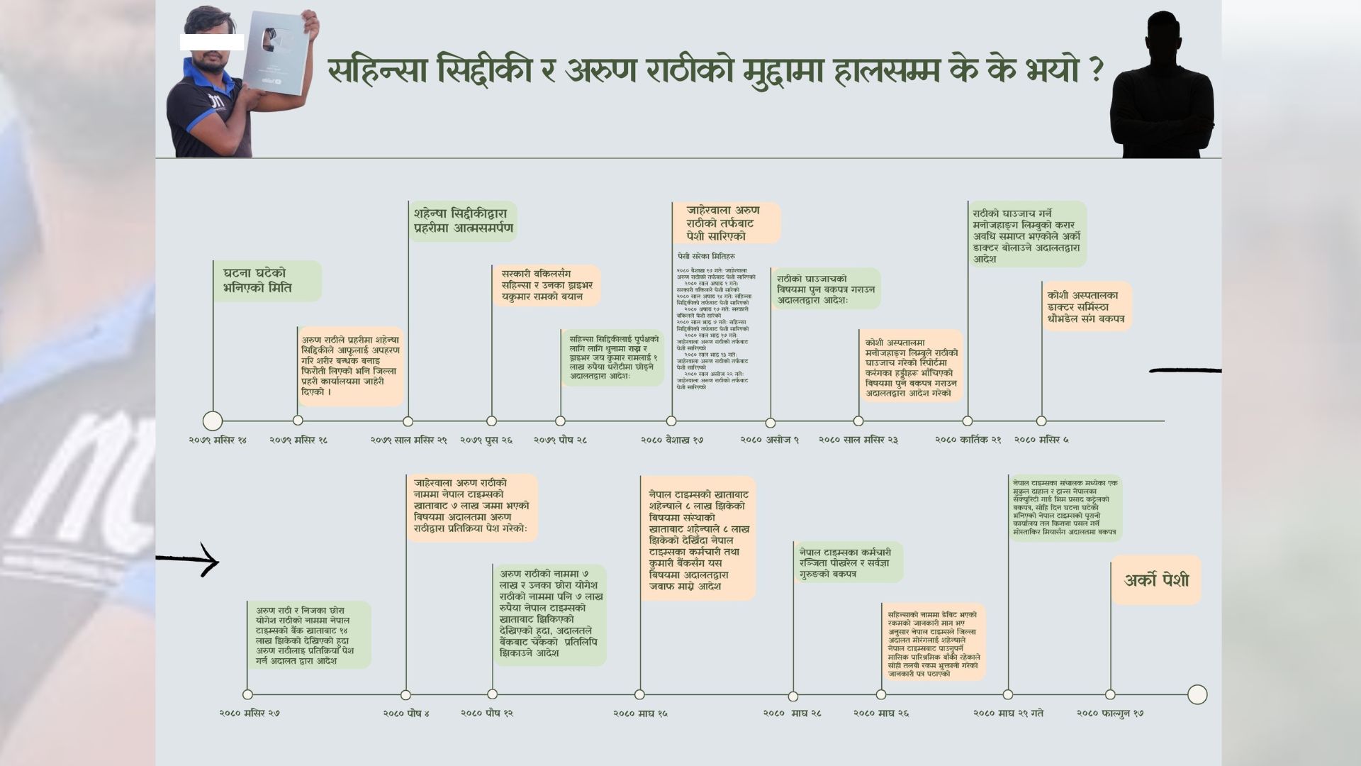 उनको आठ पटक पेशी सरिसकेको छ भने अझै फैसला कुरेर बसिरहेका छन् । दुई साझेदार बीच भएको आपसी मतभेदको कारण आफू कारागारमा बस्नु परेको सिद्दिकीको जिकिर छ । उता नेपाल टाइम्सका अर्का साझेदार अरुण राठीले प्रहरीमा दिएको उजुरी अनुसार, सिद्दिकीले उनलाई चुनावी भिडियो बनाउने बहानामा २०७९ मंसिर १४ गते अपहरण गरि शरीर बन्धक बनाइ फिरौती लिएको अभियोग छ । अरुण राठी र सहिन्सा सिद्दिकीको मुद्दाको अहिलेसम्मको घटनाक्रम यस प्रकार रहेको छ ।