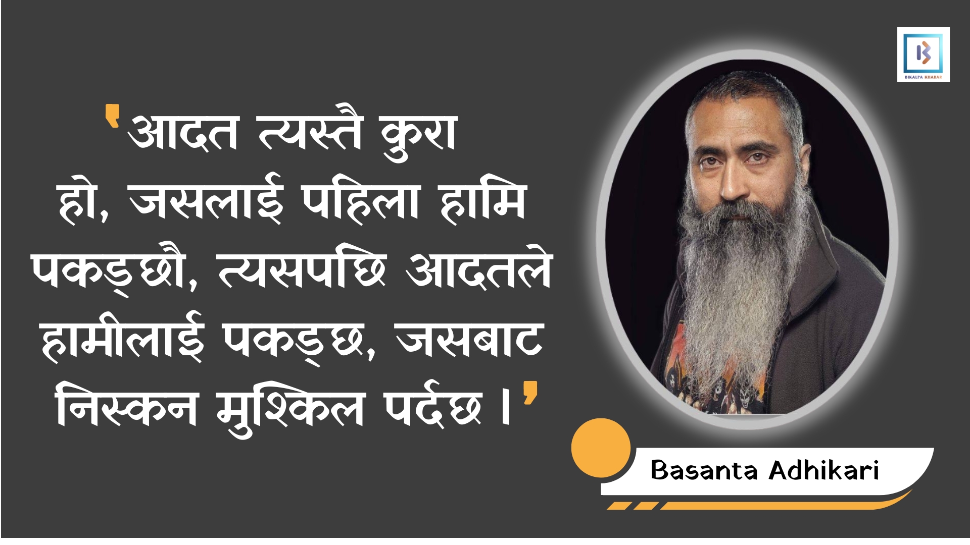 आदत त्यस्तै कुरा हो, पहिले हामि यसलाई पकड़छौ, त्यसपछि आदतले हामीलाई पकड़छ, जसबाट निस्कन हामीलाई मुश्किल पर्दछ । भनिन्छ आदत जाडोको न्यानो ओछ्यान जस्तो हुन्छ, जसभित्र छिर्न सजिलो हुन्छ, तर निस्कन गाह्रो । आदत भन्ने कुरा एकदम बलियो हुन्छ, एकपटक यसको चंगुलमा फसेपछि निस्कन सहज छैन । मानिसहरु परिवार, साथीभाइ, इष्टमित्र, जागिर, इज्जत सबैकुरा गुमाउन तयार हुन्छन, तर आदत छोड्न तयार हुँदैनन् । आदतलाई छोड्नु भन्दा पनि यसलाई निरन्तरता दिन सहज महसुस हुन्छ ।