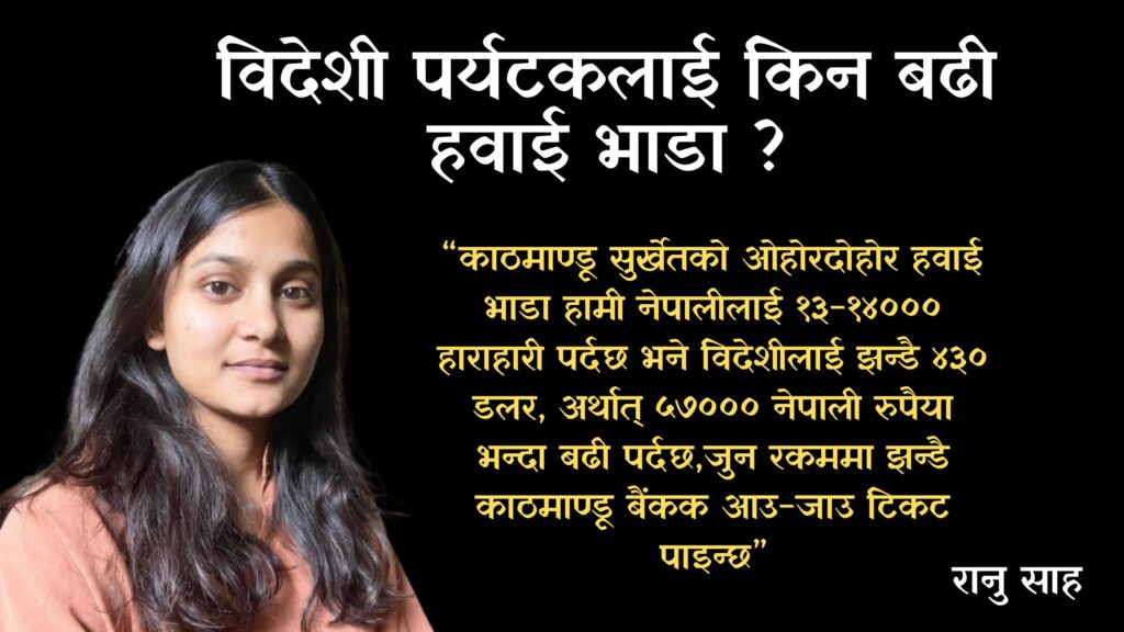 किन यती धेरै रकमको फरक ? के विदेशीले एउटा सिटको ठाउँमा दुइटा सिट ओगट्ने हो र ? के उनीहरुलाई हामी धेरै रकम तिरे बापत विशेष सुविधा दिन्छौ? यदि होइन भने किन अन्तर्राष्ट्रिय यात्रुहरूलाई टाढा धकेल्ने र देशको पर्यटन उद्योगमा नकारात्मक असर पार्ने नीति-नियम हामी अवलम्बन गरि रहेका छौ ?