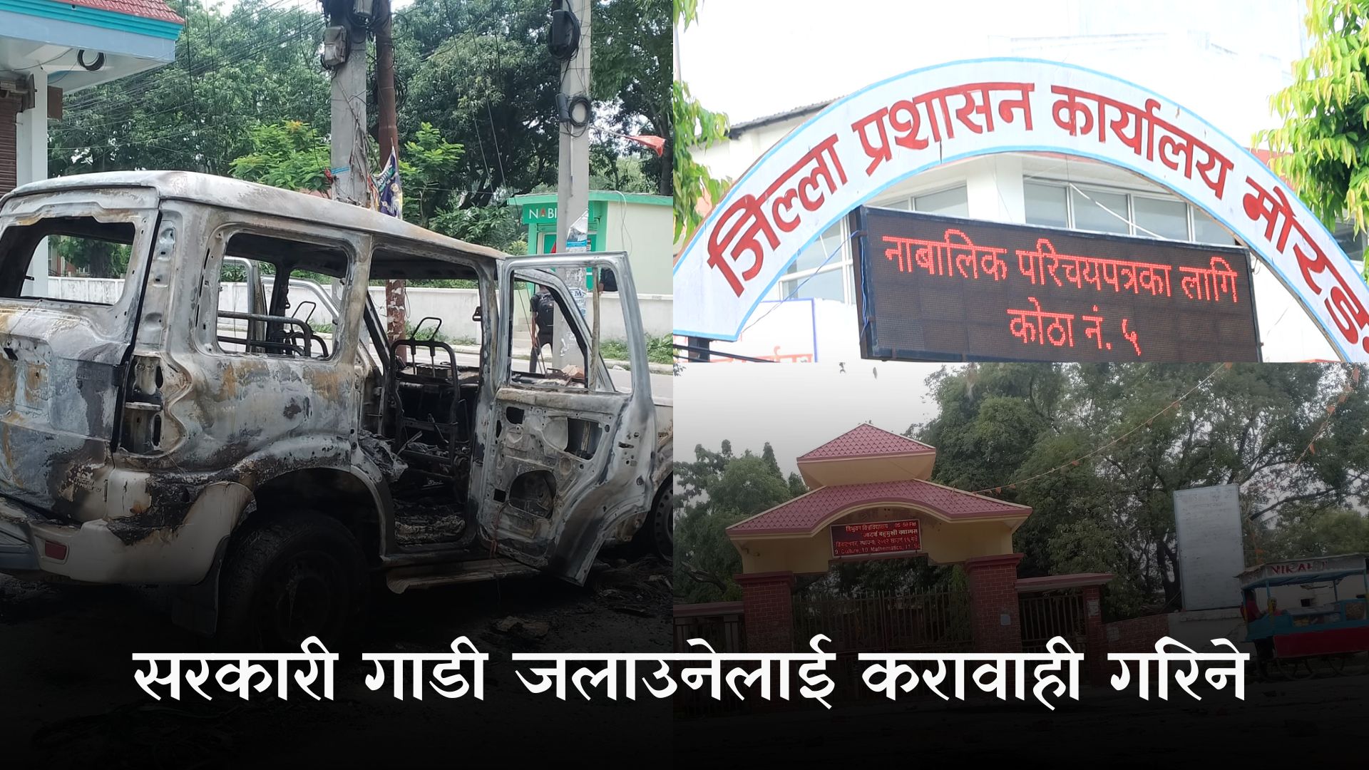 महेन्द्र मोरङ आदर्श बहुमुखी क्याम्पस अगाडी सरकारी गाडी आगजनी गर्नेलाई चाडोभन्दा चाडो कारवाही गर्ने जिल्ला प्रशासन कार्यालय मोरंगले जनाएको छ । विकल्प खबरका सम्वाददाता संगको कुराकानीमा जिल्ला प्रशासन कार्यालय मोरंगका प्रमुख जिल्ला अधिकारी प्रेम प्रसाद भटराईले प्रहरीले हाल यस विषयमा अनुसन्धान गरिरहेको तथा गाडी तोडफोड र आगजनीमा संग्लनहरुको नाम तथा पहिचान यकिन गर्ने काम पनि भइरहेको हुनाले चाडै नै दोषी उपर कानुन बमोजिम कारवाही हुने बताएका छन ।
