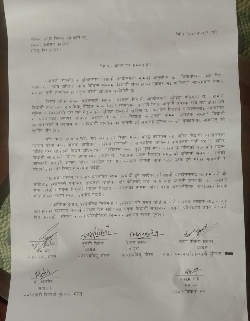 नेविसंघ मोरङ सभापति सरोज पोखरेल , अनेरास्ववियु मोरङका अध्यक्ष तुलसी घिमिरे , अनेरास्ववियु मोरङ अध्यक्ष मिलन बस्नेत, नेपाल समाजवादी विद्यार्थी युनियनक अध्यक्ष तरुण विक्रम खवास, समाजवादी विद्यार्थी युनियन मोरङ अध्यक्ष मोहम्मद शमसेर र जनमत विद्यार्थी संघ मोरङका संयोजक प्रकाश शाहको हस्ताक्षर रहेको बिग्यप्तीमा २६ गते आइतवार विराटनगर स्थित महेन्द्र मोरङ्ग क्याम्पस गेट बाहिर विद्यार्थी आन्दोलनका नाममा कोशी प्रदेश योजना आयोगको गाडीमा आगजनी र पान्त्रालीमा अवस्थित कंचनजंगा पाटी प्यालेस वाहिर पार्किङ गरेर राखिएको विद्युत प्राधिकरणका गाडीहरुमा समेत ढुङ्गा मुडा सहित तोडफोड गरिएको घटनाप्रति संयुक्त विद्यार्थी संगठनको गम्भिर ध्यानाकर्षण भएको जनाउदै घटनामा संयुक्त विद्यार्थी संगठनको कुनैपनी संलग्नता नरहेको जानकारी गराइएको छ।