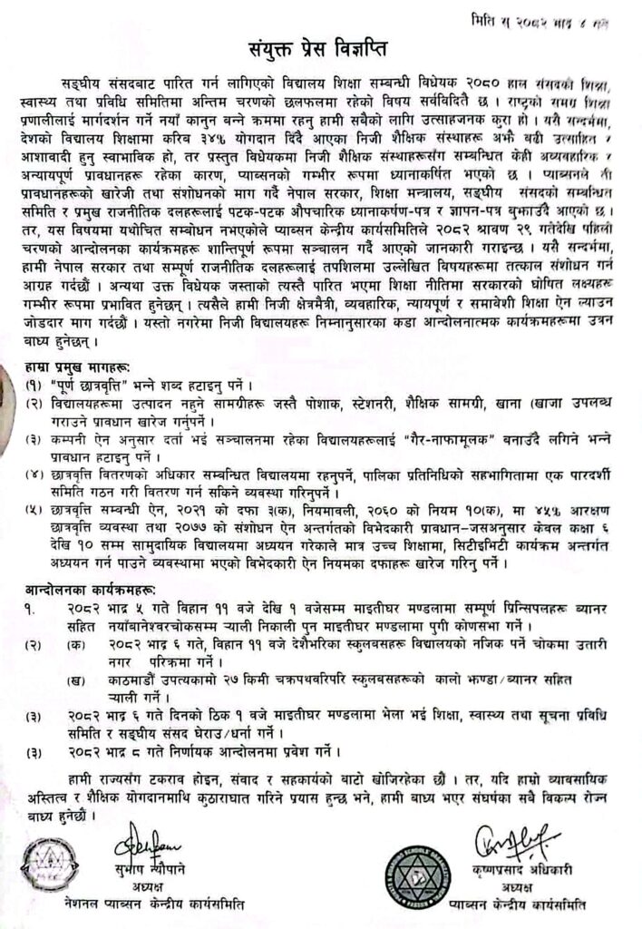 विराटनगर। सङ्घीय संसद्को शिक्षा, स्वास्थ्य तथा प्रविधि समितिमा छलफलको अन्तिम चरणमा रहेको विद्यालय शिक्षा सम्बन्धी विधयेकप्रति असहमति जनाउँदै निजी विद्यालयका छाता संगठन प्याब्सन र एनप्याब्सन ५ बुँदे माग अघि सार्दै आन्दोलनमा उत्रिएका छन्। आज काठमाडौँ स्थित माइतीघर मण्डलामा शिक्षा विधयेकका प्रस्तावित प्रावधानप्रति असहमति जनाउँदै निजी विद्यालय सञ्चालकहरू आन्दोलनमा उत्रिएका हुन्।