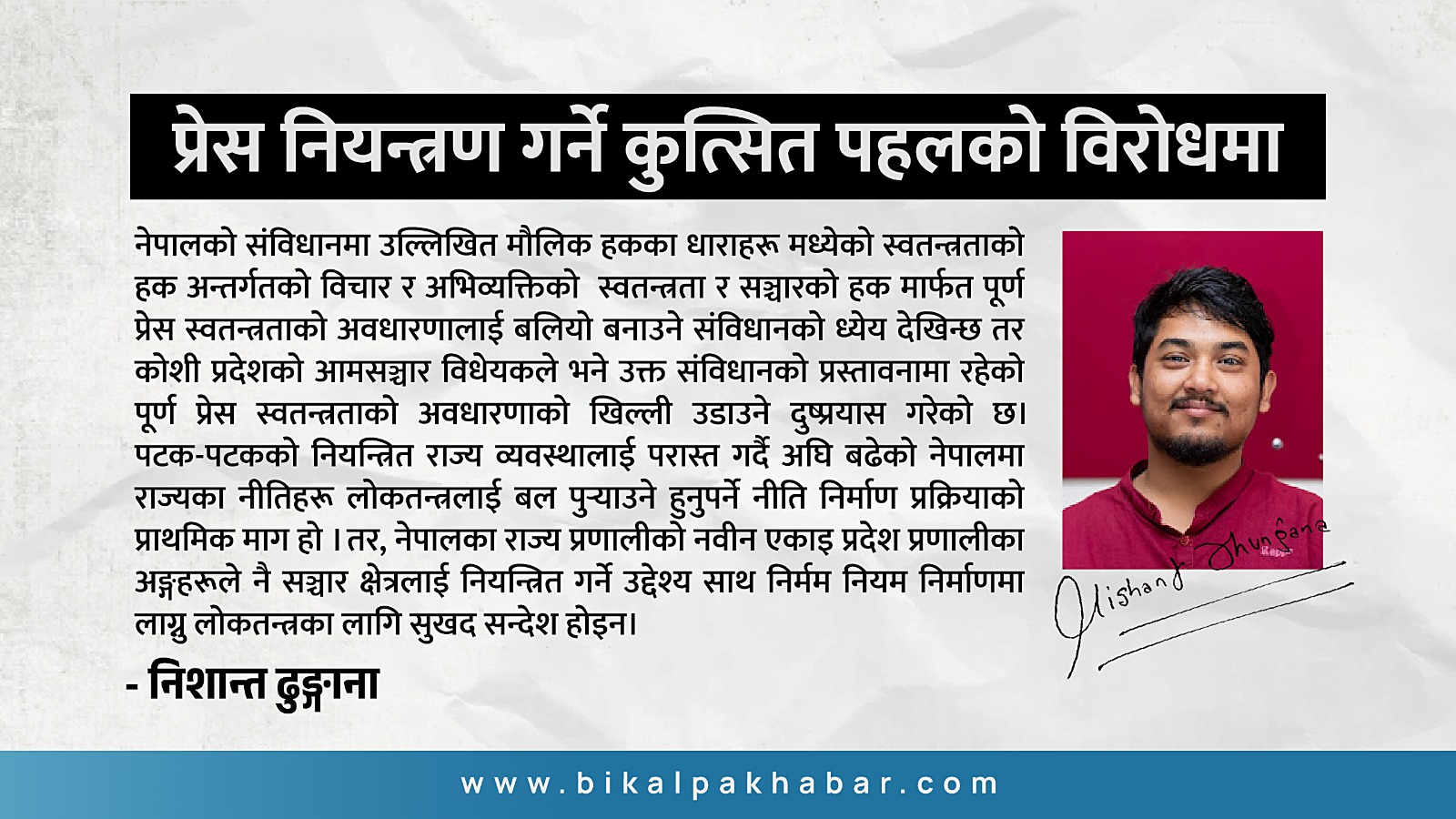 नेपालको संविधानमा उल्लिखित मौलिक हकका धाराहरू मध्येको स्वतन्त्रताको हक अन्तर्गतको विचार र अभिव्यक्तिको स्वतन्त्रता र सञ्चारको हक मार्फत पूर्ण प्रेस स्वतन्त्रताको अवधारणालाई बलियो बनाउने संविधानको ध्येय देखिन्छ तर कोशी प्रदेशको आमसञ्चार विधेयकले भने उक्त संविधानको प्रस्तावनामा रहेको पूर्ण प्रेस स्वतन्त्रताको अवधारणाको खिल्ली उडाउने दुष्प्रयास गरेको छ। पटक-पटकको नियन्त्रित राज्य व्यवस्थालाई परास्त गर्दै अघि बढेको नेपालमा राज्यका नीतिहरू लोकतन्त्रलाई बल पुर्याउने हुनुपर्ने नीति निर्माण प्रक्रियाको प्राथमिक माग हो । तर, नेपालका राज्य प्रणालीको नवीन एकाइ प्रदेश प्रणालीका अङ्गहरूले नै सञ्चार क्षेत्रलाई नियन्त्रित गर्ने उद्देश्य साथ निर्मम नियम निर्माणमा लाग्नु लोकतन्त्रका लागि सुखद सन्देश होइन।