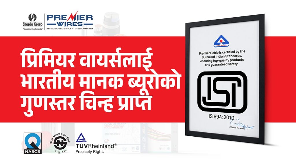विराटनगर। प्रिमियर वायर्सले भारतीय मानक ब्यूरो(बीआईएस)बाट गुणस्तर चिन्ह प्राप्त गरेको छ। सारडा समूहद्वारा सञ्चालित मोरङको बुढीगंगा गाउँपालिकामा रहेको उद्योगमा उत्पादन हुने प्रिमियर वायर्सले ब्यूरोबाट गुणस्तर चिन्ह प्राप्त गरेको हो।