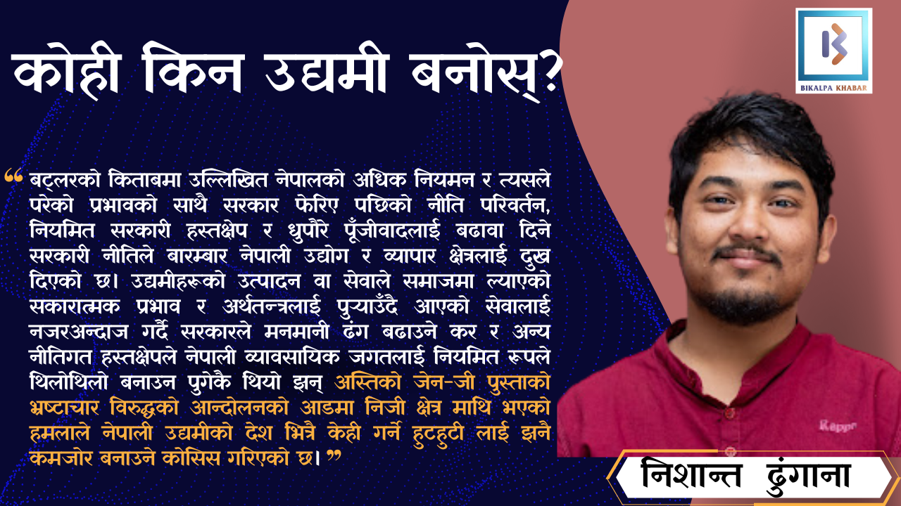 बट्लरको किताबमा उल्लिखित नेपालको अधिक नियमन र त्यसले परेको प्रभावको साथै सरकार फेरिए पछिको नीति परिवर्तन, नियमित सरकारी हस्तक्षेप र धुपौरे पुँजीवादलाई बढावा दिने सरकारी नीतिले बारम्बार नेपाली उद्योग र व्यापार क्षेत्रलाई दुख दिएको छ। उद्यमीहरूको उत्पादन वा सेवाले समाजमा ल्याएको सकारात्मक प्रभाव र अर्थतन्त्रलाई पुर्याउदै आएको सेवालाई नजरअन्दाज गर्दै सरकारले मनमानी ढंग बढाउने कर र अन्य नीतिगत हस्तक्षेपले नेपाली व्यावसायिक जगतलाई नियमित रूपले थिलोथिलो बनाउन पुगेकै थियो झन् अस्तिको जेन-जी पुस्ताको भ्रष्टाचार विरुद्धको आन्दोलनको आडमा निजी क्षेत्र माथि भएको हमलाले नेपाली उद्यमीको देश भित्रै केही गर्ने हुटहुटीलाई झनै कमजोर बनाउने कोसिस गरिएको छ।